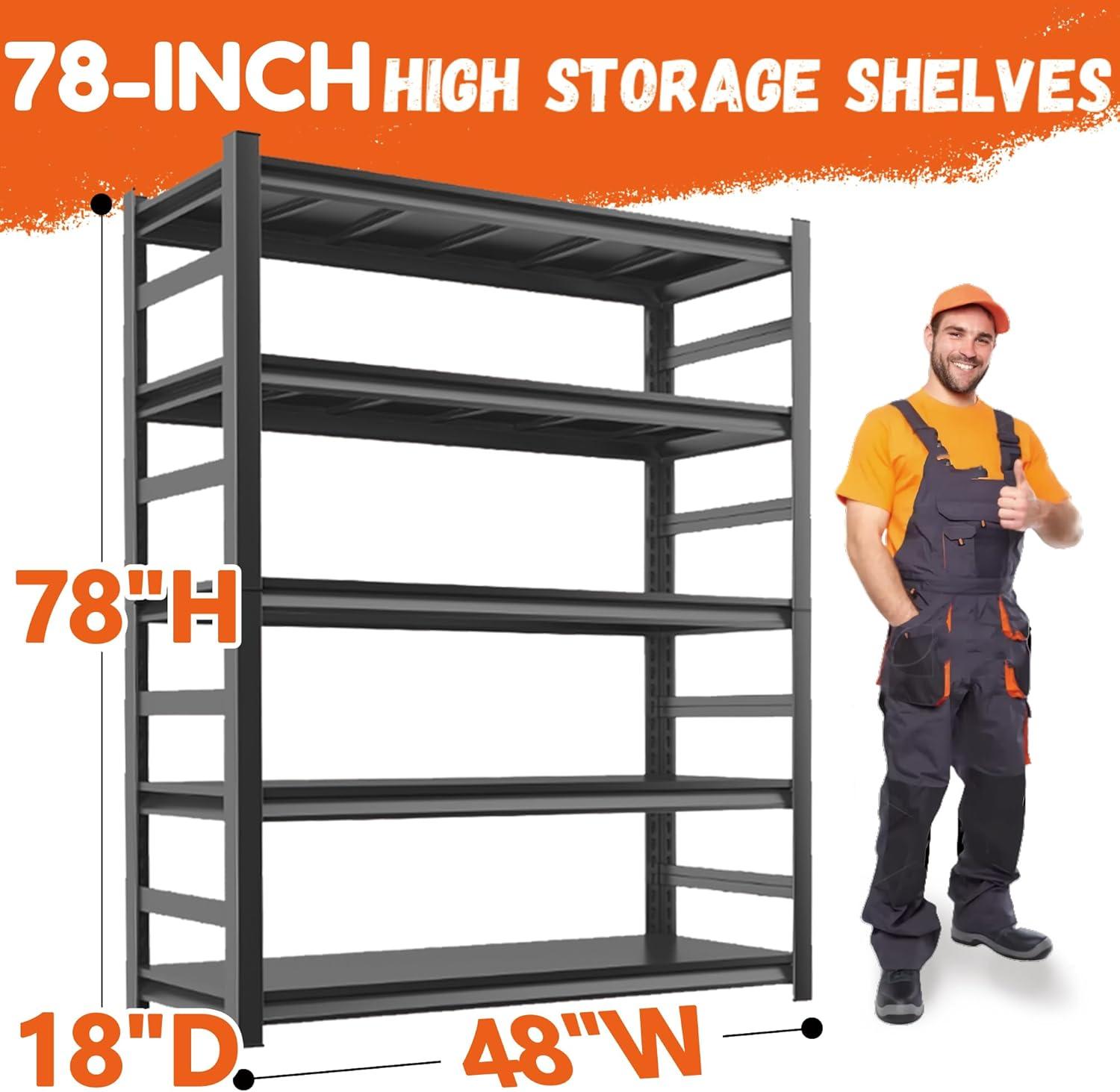48" W Metal Garage Shelving Unit, Heavy Duty Storage Garage Shelves with High Load Capacity, 5-Tier Big Metal Shelf, Ideal for Warehouse and Basement, Black,78" H(78"H x 48"W x 18"D)