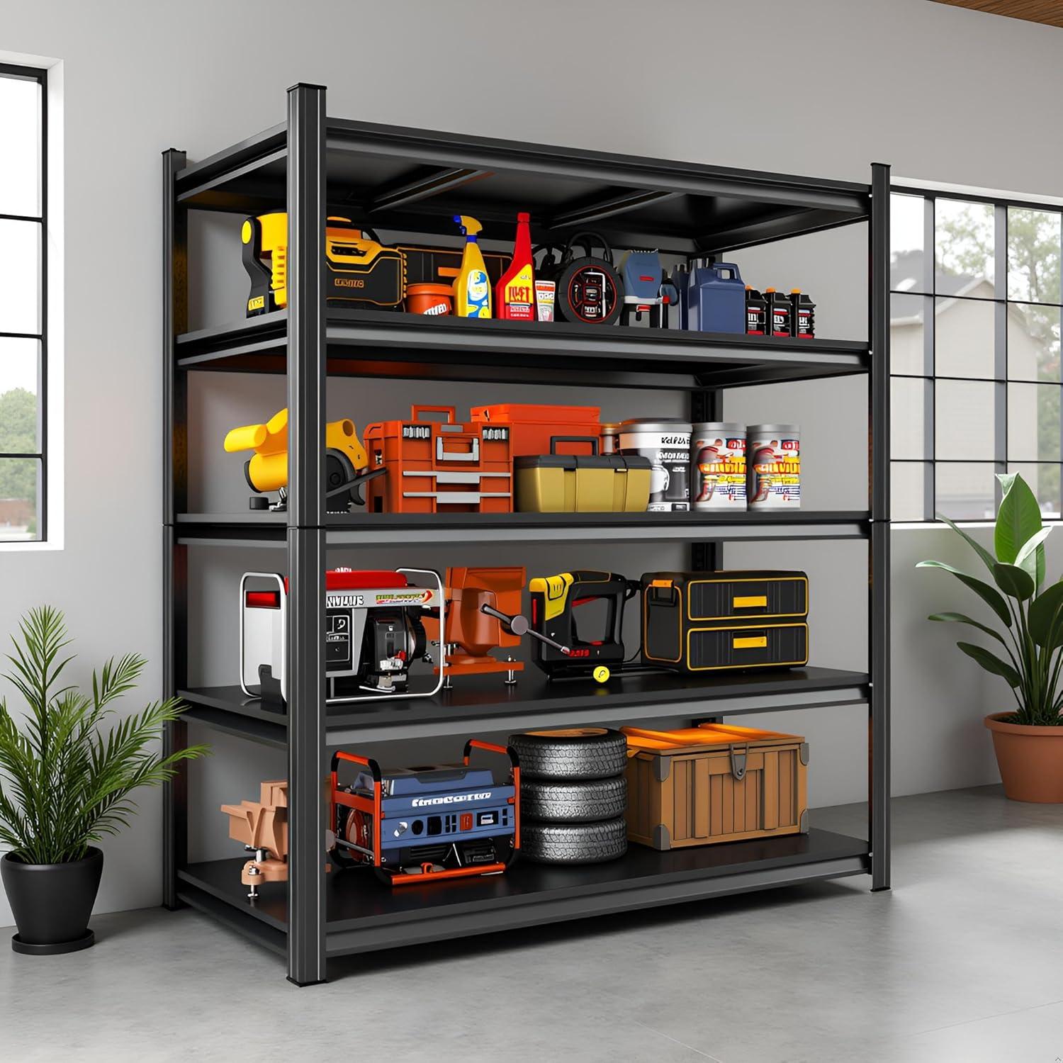 Metal Garage Shelving Unit, Heavy Duty 5-Tier Adjustable Storage shelves, Steel Shelving, 3000 lbs Capacity, Industrial Shelves for Heavy Tools and Equipment, Ideal for Garage, Basement, Black, 72″(With Fences 78″H x 47.5″W x 18″D)
